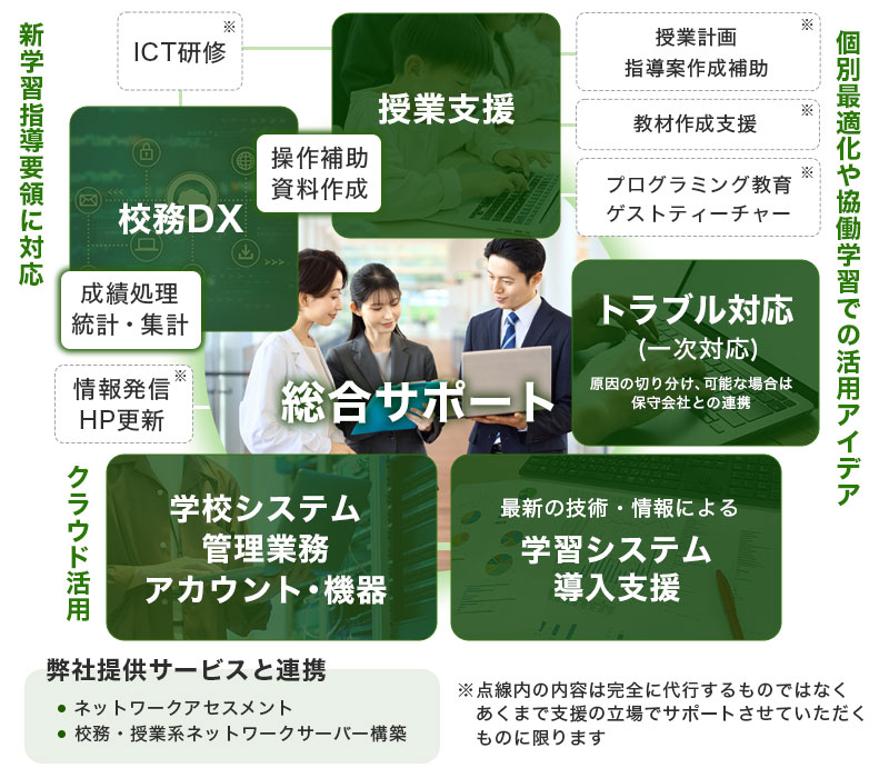 そして、これからの予測し得ない社会(VUCA/Society5.0)に生きる子どもたちへ、たしかな未来型教育が実現されるよう、学校に寄り添いながら、総合的に支援させていただきます。